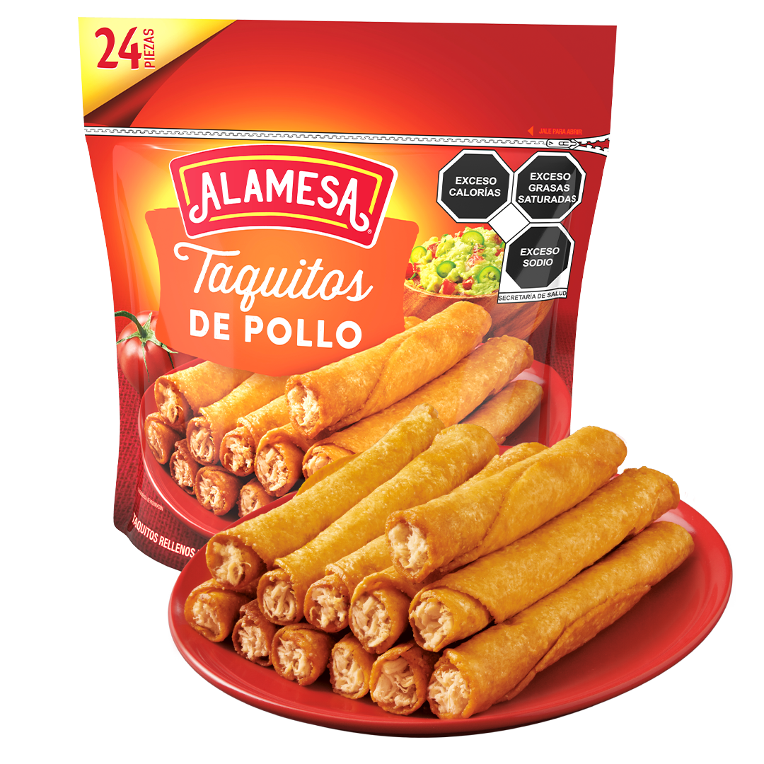 Tortilla (harina de maíz nixtamalizado, agua, sal yodada, glutamato monósodico, CMC, hidróxido de calcio, amarillo 5, amarillo 6), relleno (pechuga de pollo 70.96%, agua, sal yodada, maltodextrina, almidón de maíz, polifosfato de sodio, proteína vegetal hidrolizada, carragenina, especias, dióxido de silicio, harina de trigo, aceite vegetal, azúcares añadidos [azúcar], curcumina, oleoresina de pimentón, pimienta, hierba aromática, saborizantes naturales, extracto de levadura, saborizantes artificiales, inosinato de sodio, guanilato de sodio, ácido cítrico, fosfato de calcio), harina de soya desgrasada y texturizada, aceite vegetal, fibra vegetal, cebolla, grasa vegetal, glicerina, chiles, almidón modificado, dextrosa, caramelo clase IV, colorante natural (betabel), benzoato de sodio y sorbato de potasio). Prefritas con aceite vegetal.